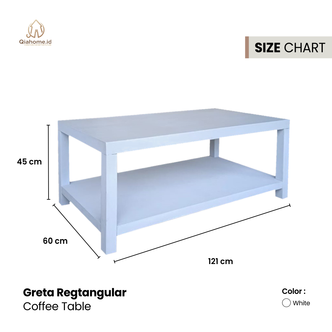 Sempurnakan ruang keluarga Anda dengan Greta Rectangular Coffee Table. Bentuknya yang persegi panjang menyediakan area permukaan yang luas, sementara warna White menjadikannya pusat perhatian yang bersih dan modern. Spesifikasi Ukuran: Panjang 121 cm, Lebar 60 cm, Tinggi 45 cm.